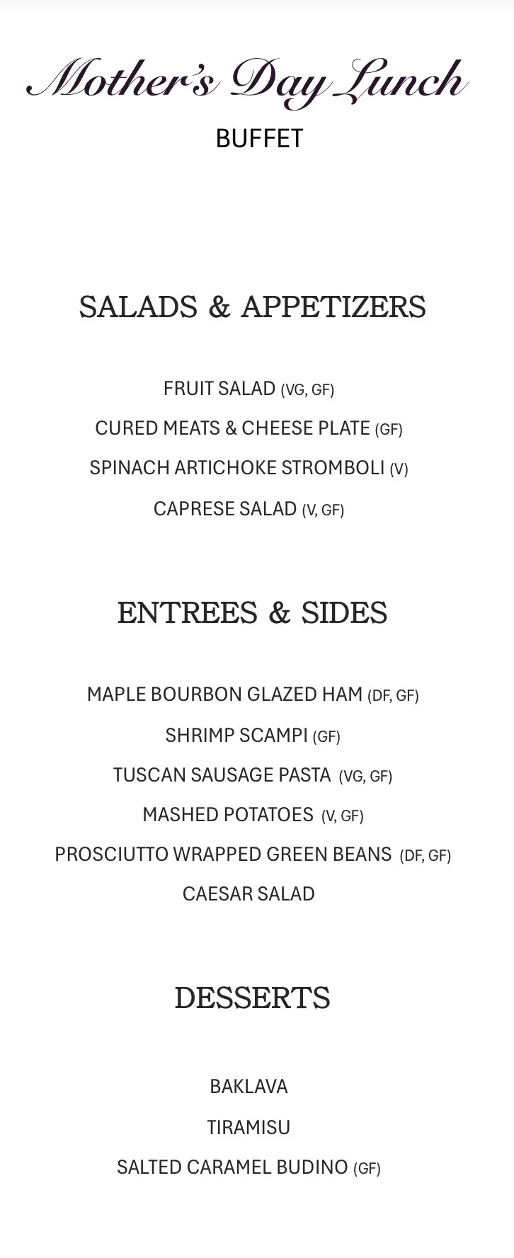 Mother’s Day Lunch Sunday, May 10, 2026 1:00 PM 3:30 PM 13:00 15:30 57625 NW Wilson River Hwy Gales Creek, OR 97117 (map) Google Calendar ICS Mother’s day lunch buffetDoors open at 12:30pm. Buffet served at 1pm$59 per person (kiddos age 4-12 $30) Reserve a table