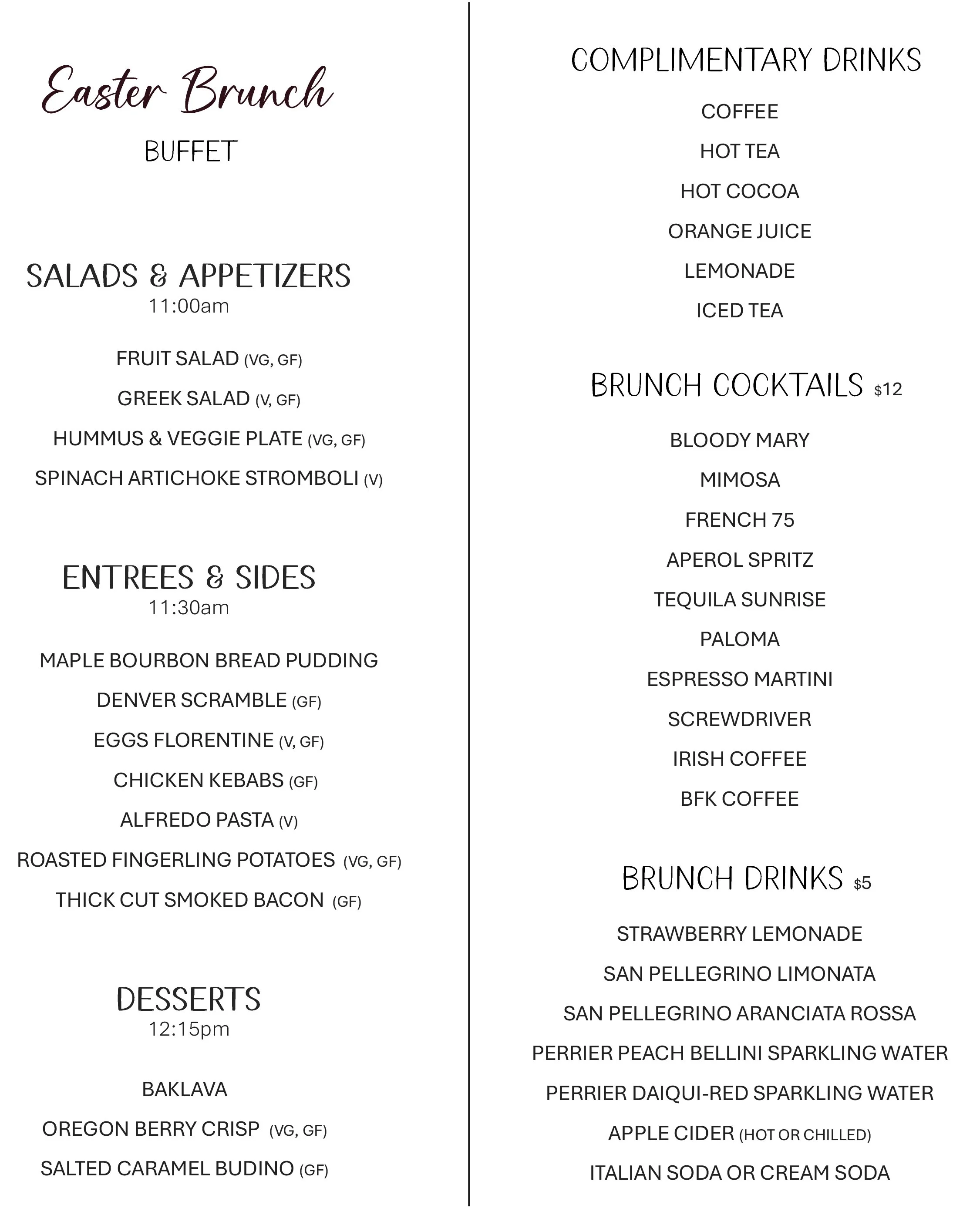 Easter Brunch Buffet Sunday, April 5, 2026 10:30 AM 1:00 PM 10:30 13:00 57625 NW Wilson River Hwy Gales Creek, OR 97117 (map) Google Calendar ICS easter brunch buffetDoors open at 10:30am. Buffet served at 11am.$50 per person (kiddos age 5-12 $25) reserve a table