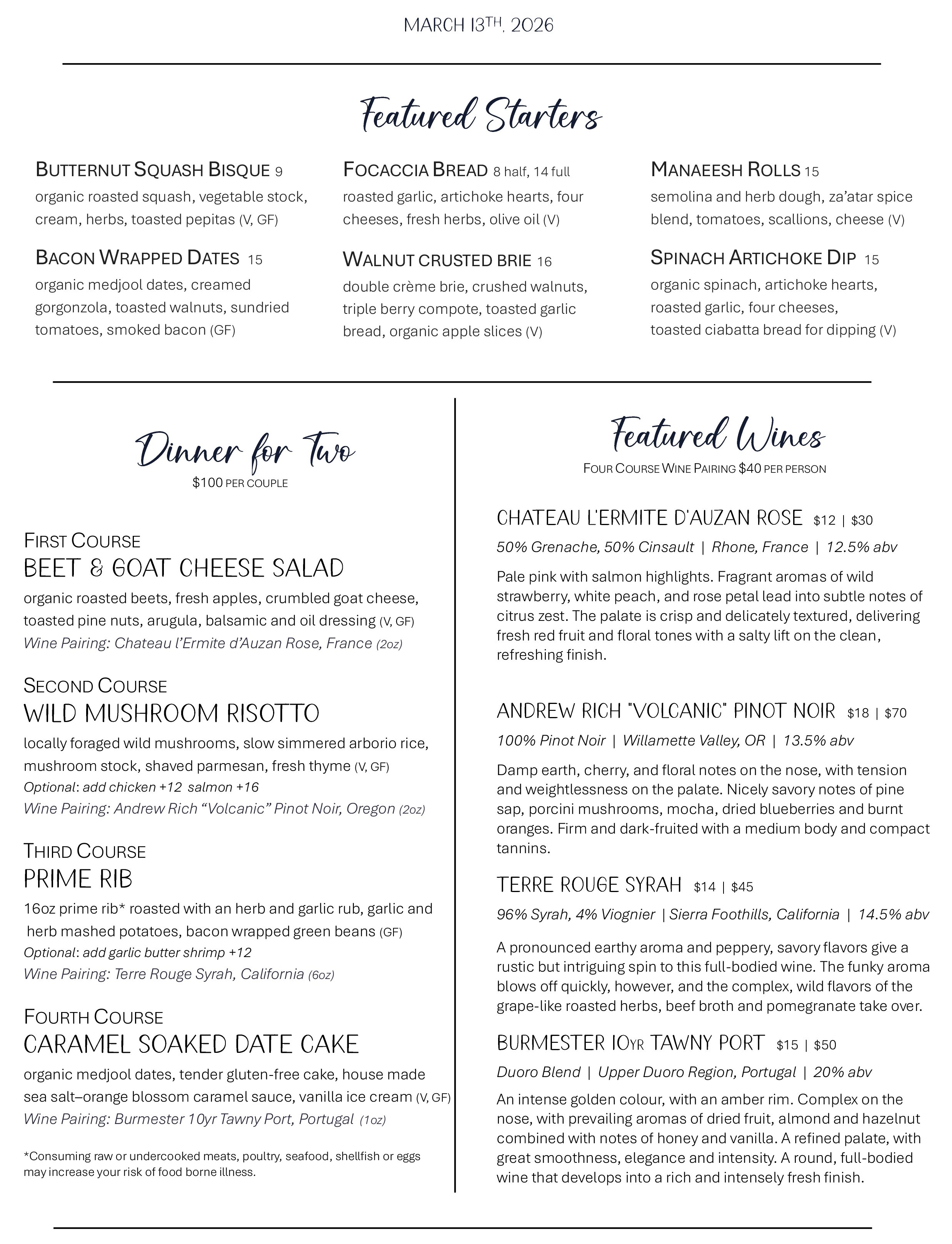 We are happy to accommodate most dietary restrictions and allergies. Please let us know at the time of reservation if you need the menu modified for any reason and we will do our best to customize each dish to fit your needs.