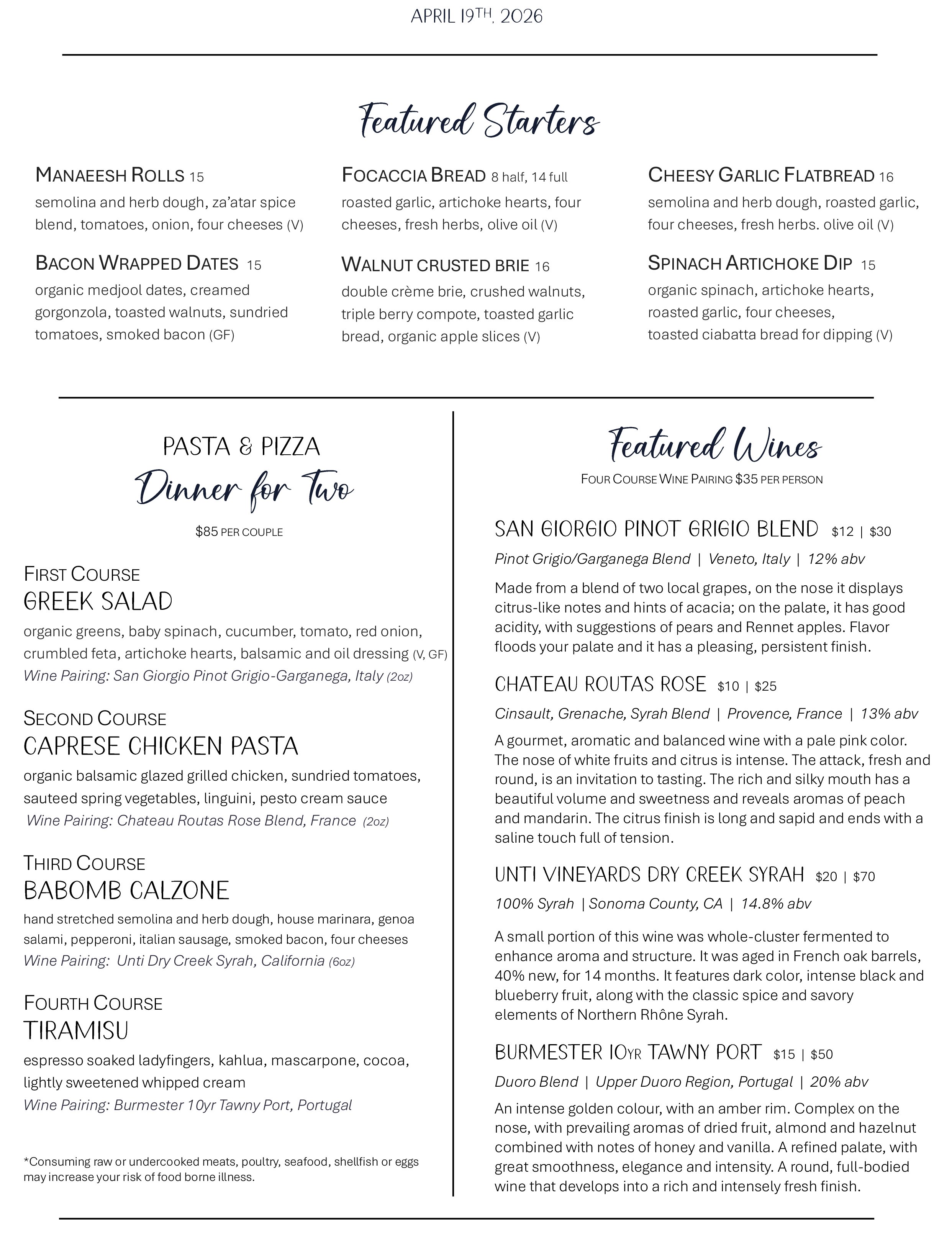 $85 per couple, a’la carte items also available.