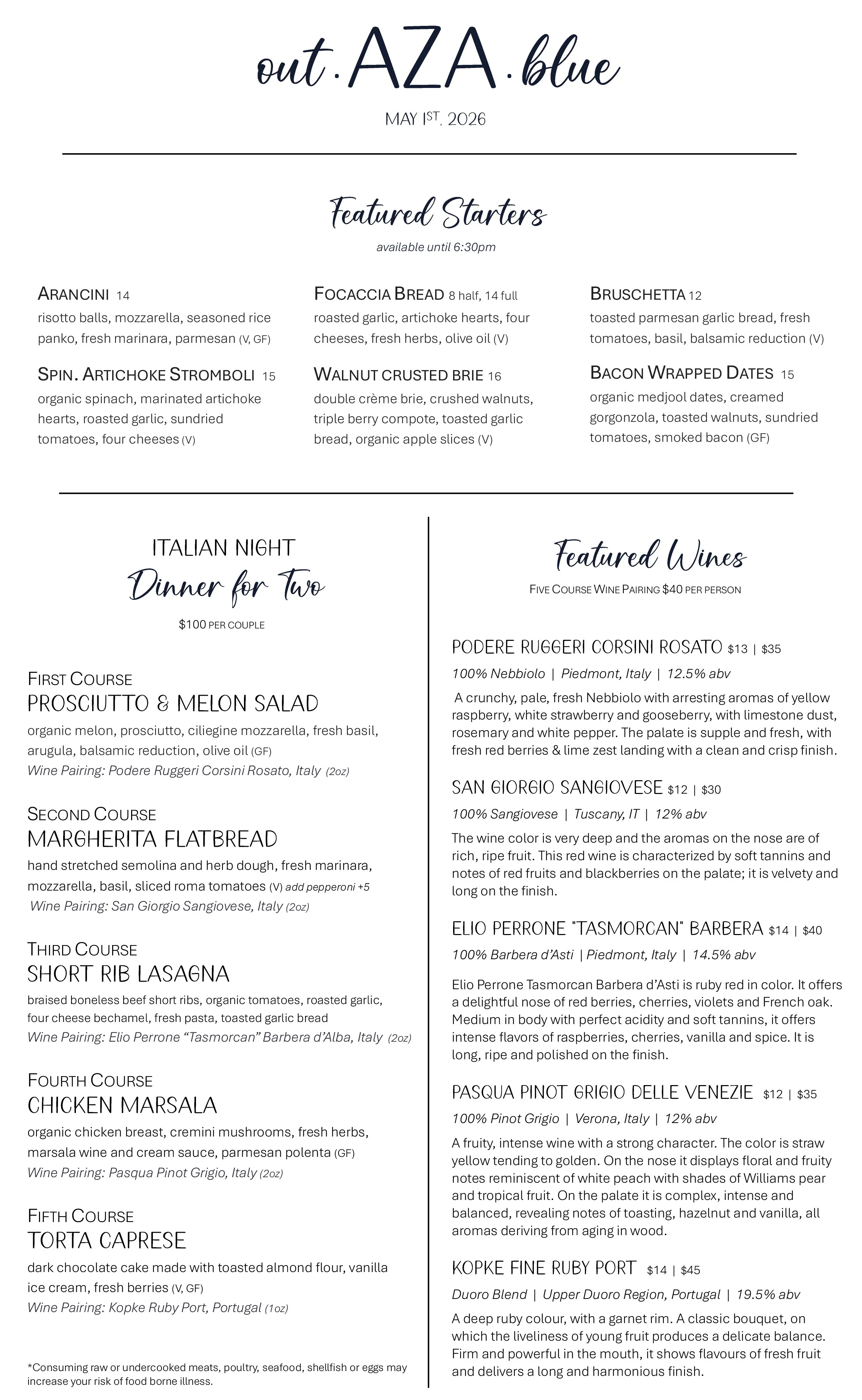 $100 per couple, a’la carte items also available.