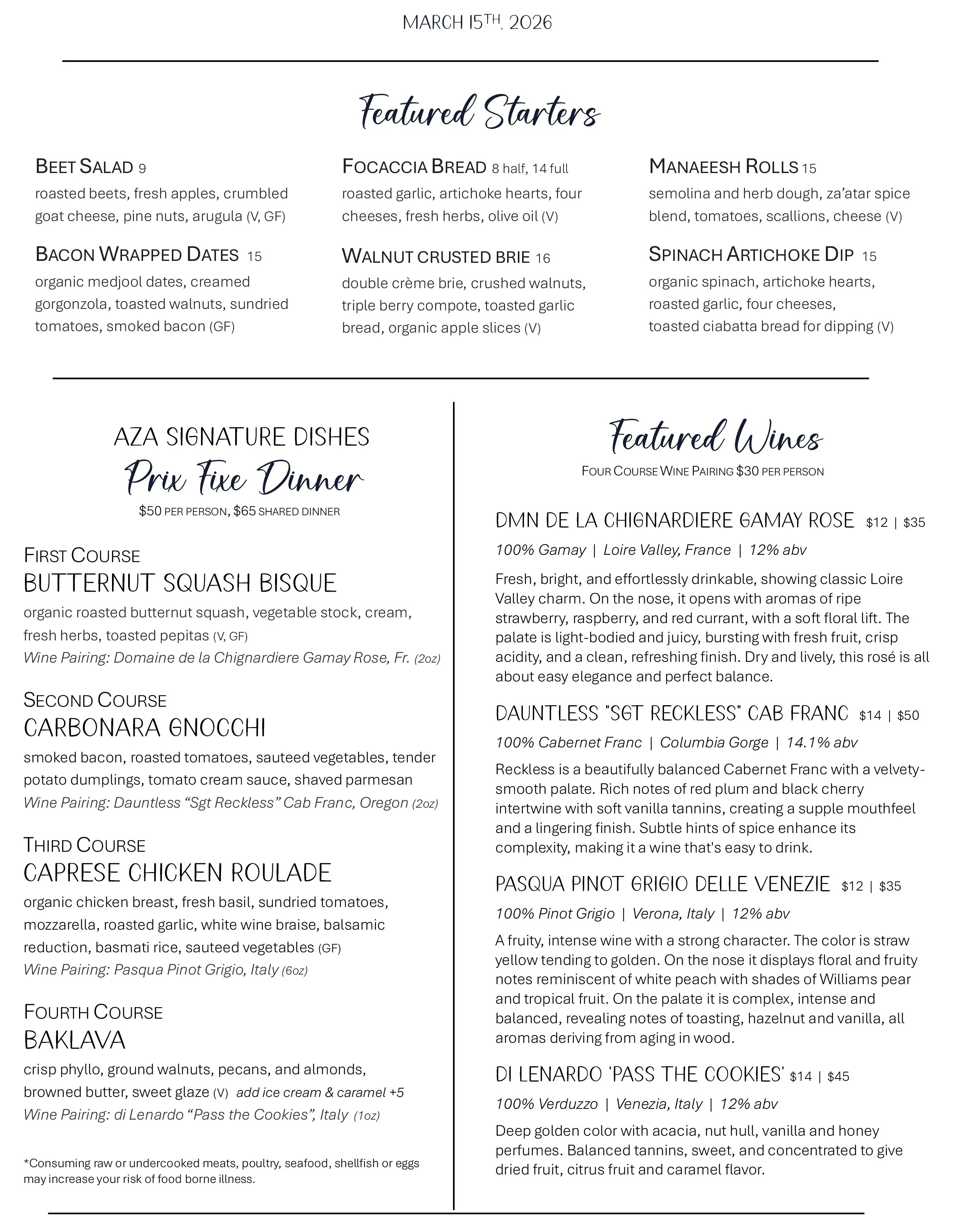 Doors open at 5:30pm for drinks and appetizers. Dinner begins promptly at 6:30pm.