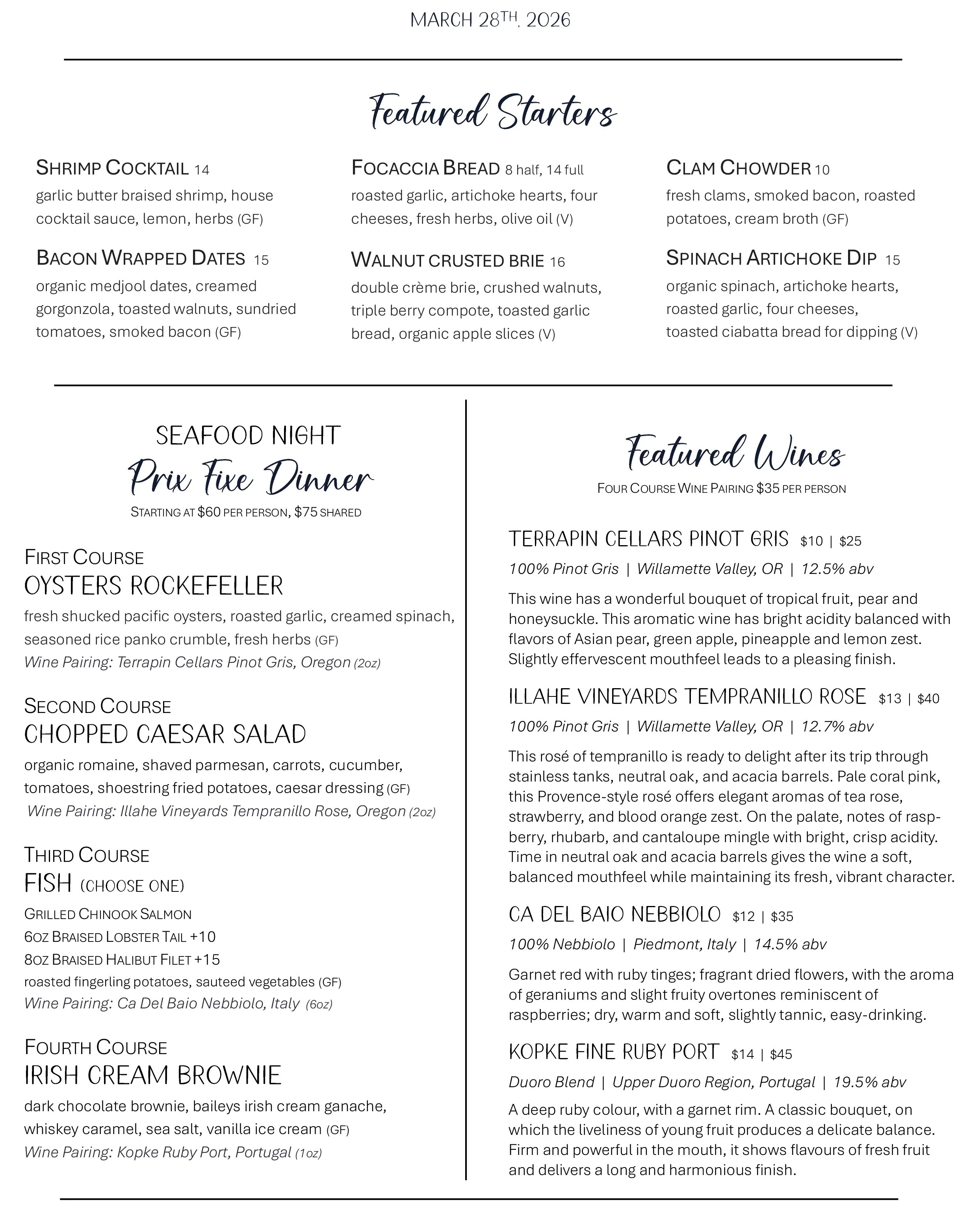 Starting at $60 per person. Shared dinners and a’la carte items also available.