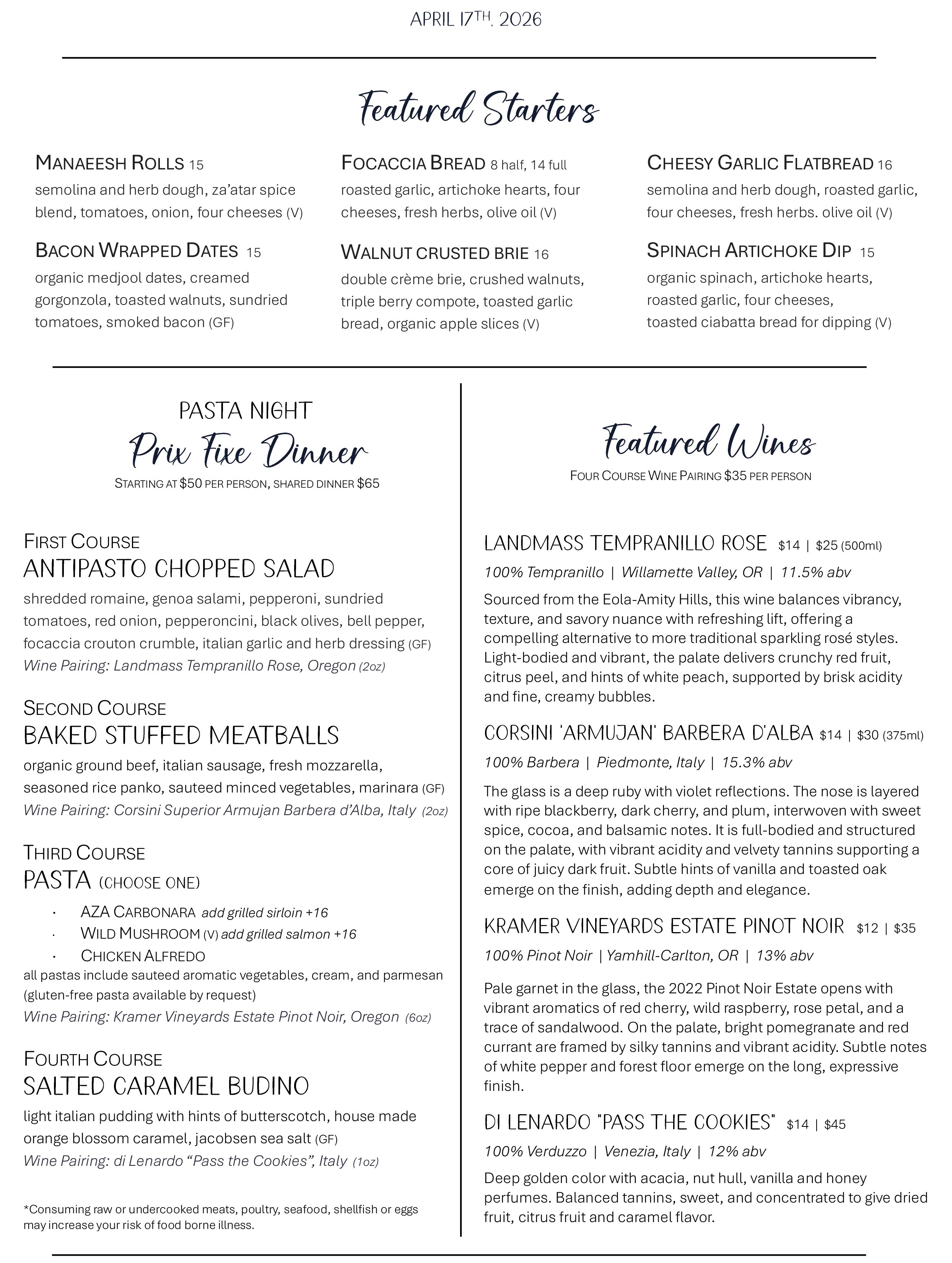 Starting at $50 per person. Shared dinners and a’la carte items also available.