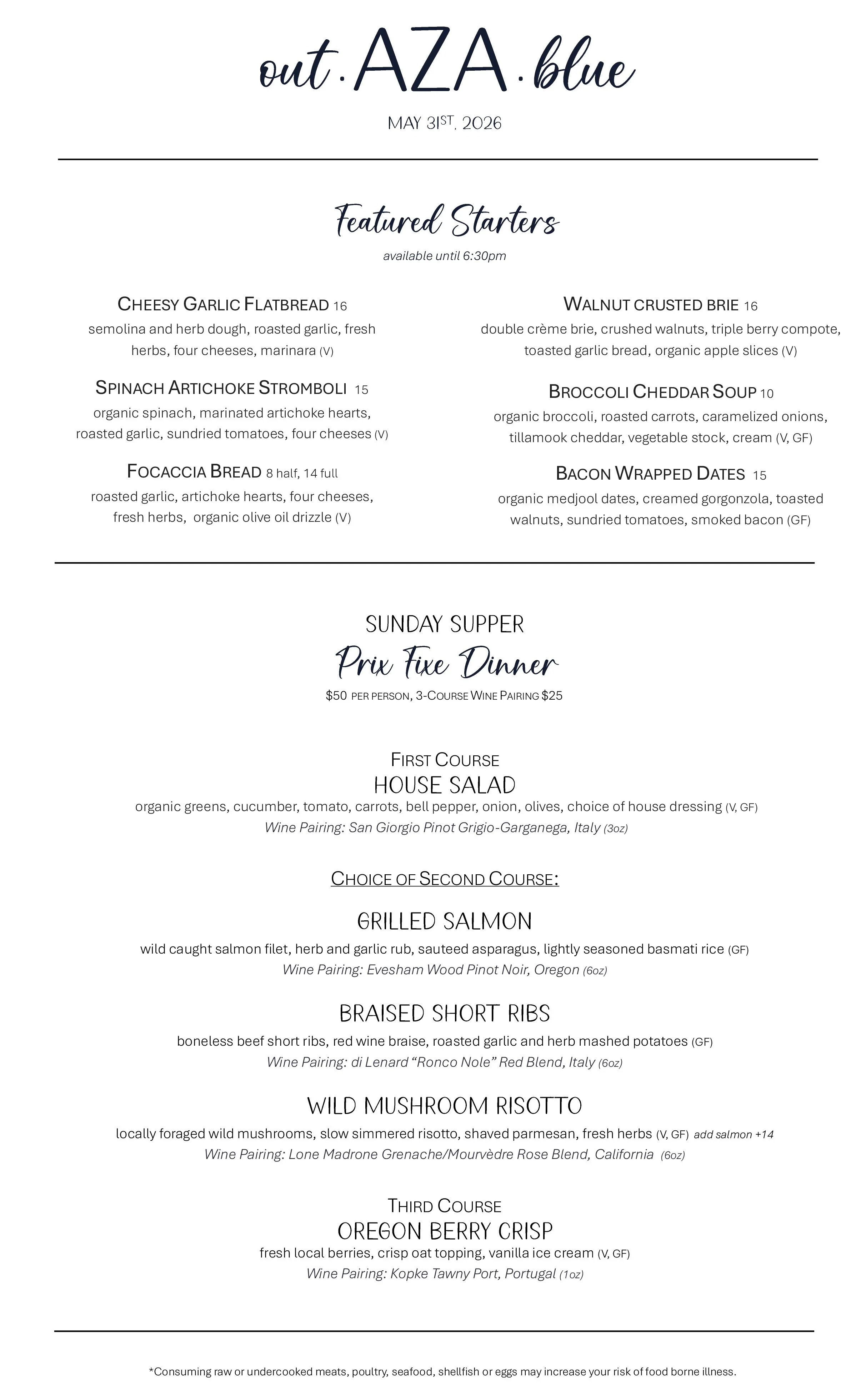 Doors open at 5:30pm for drinks and appetizers. Dinner begins promptly at 6:30pm.
