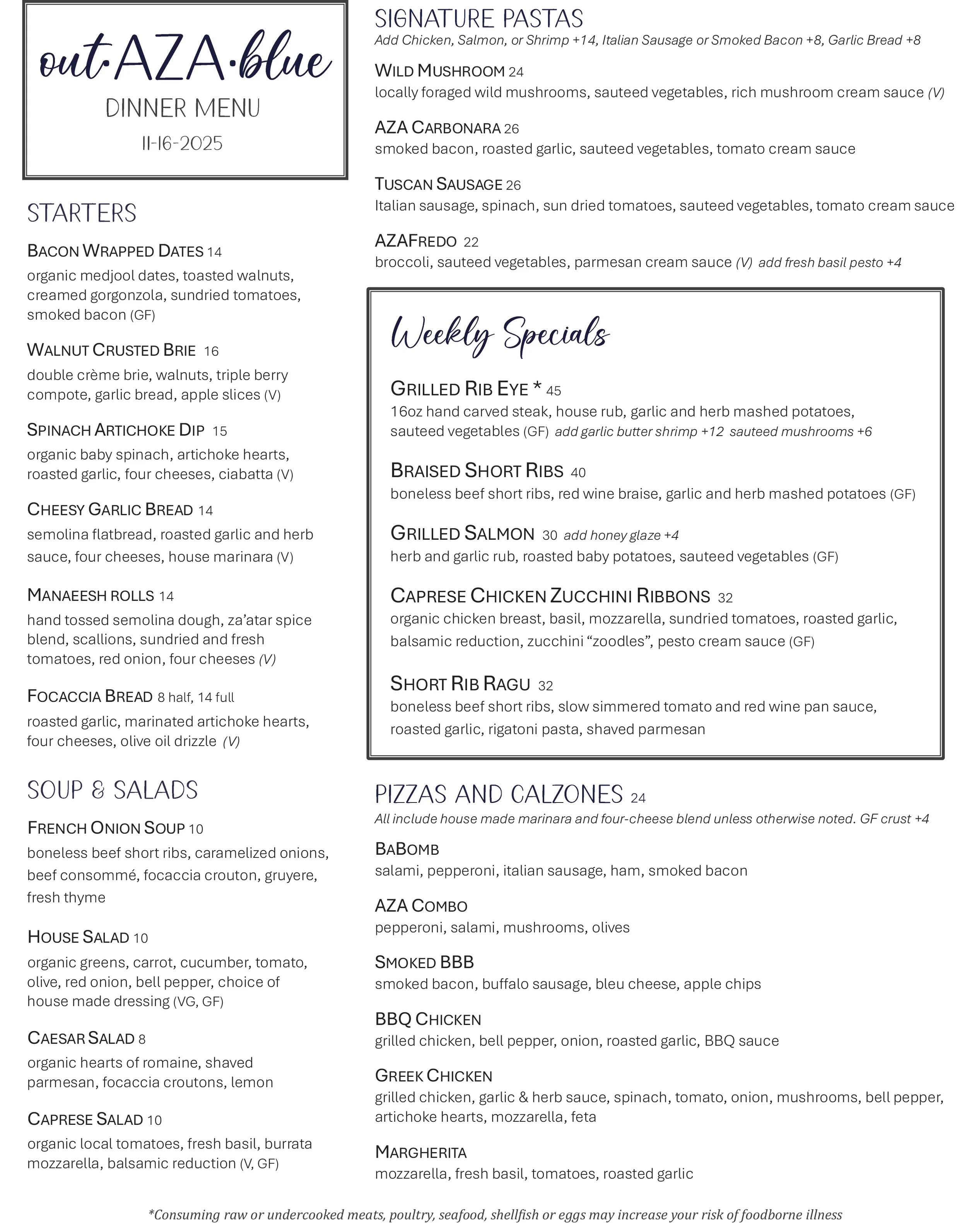 Dinner Service Sunday, November 16, 2025 4:00 PM 7:00 PM 16:00 19:00 57625 NW Wilson River Hwy Gales Creek, OR 97117 (map) Google Calendar ICS dinner serviceA’la Carte Dinner Menu Available 4:00pm-7:00pm Weekly specials are subject to change.RESERVE A TABLE