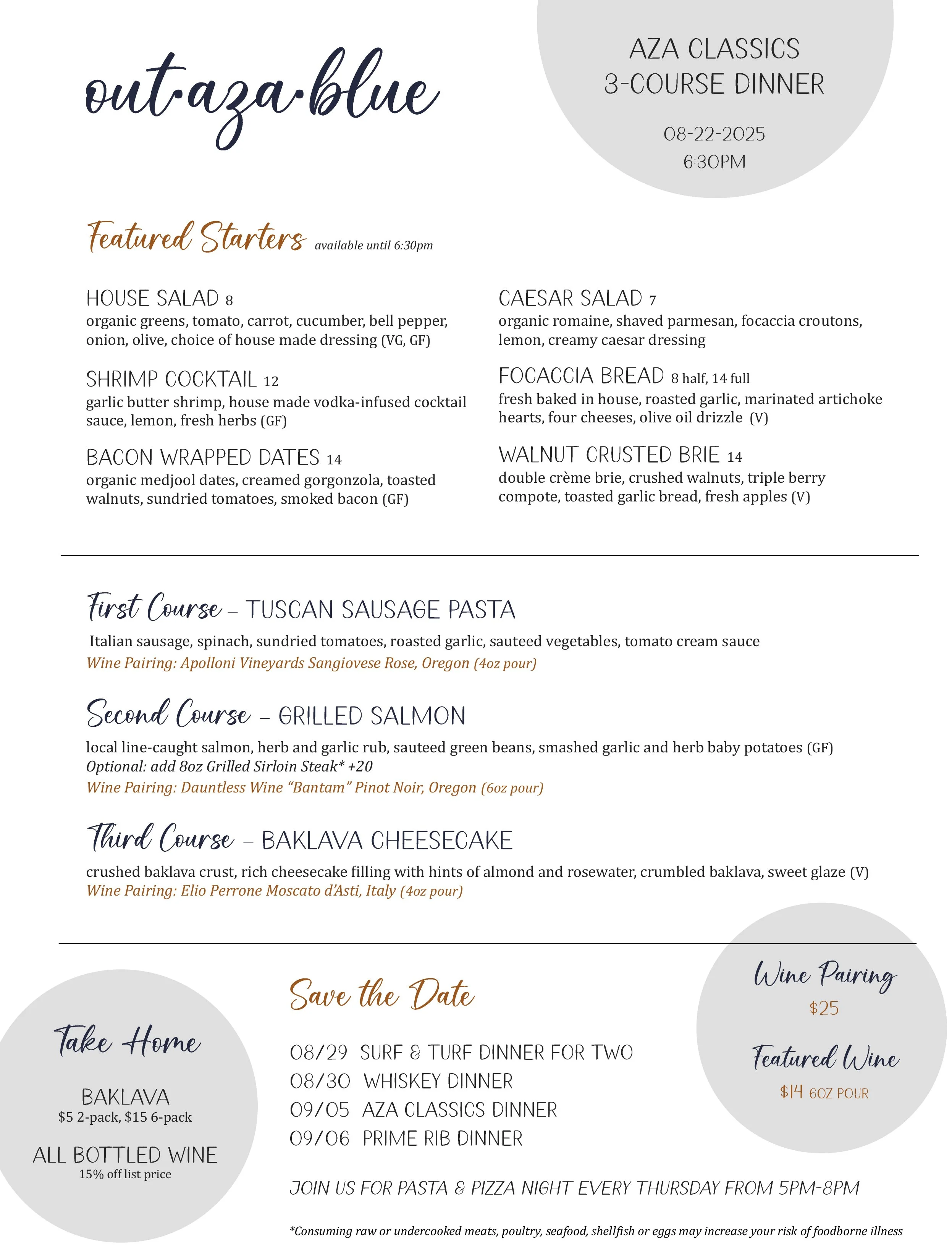 We are happy to accommodate most dietary restrictions and allergies, please let us know at the time of reservation and we will work with you to create a fabulous dining experience!