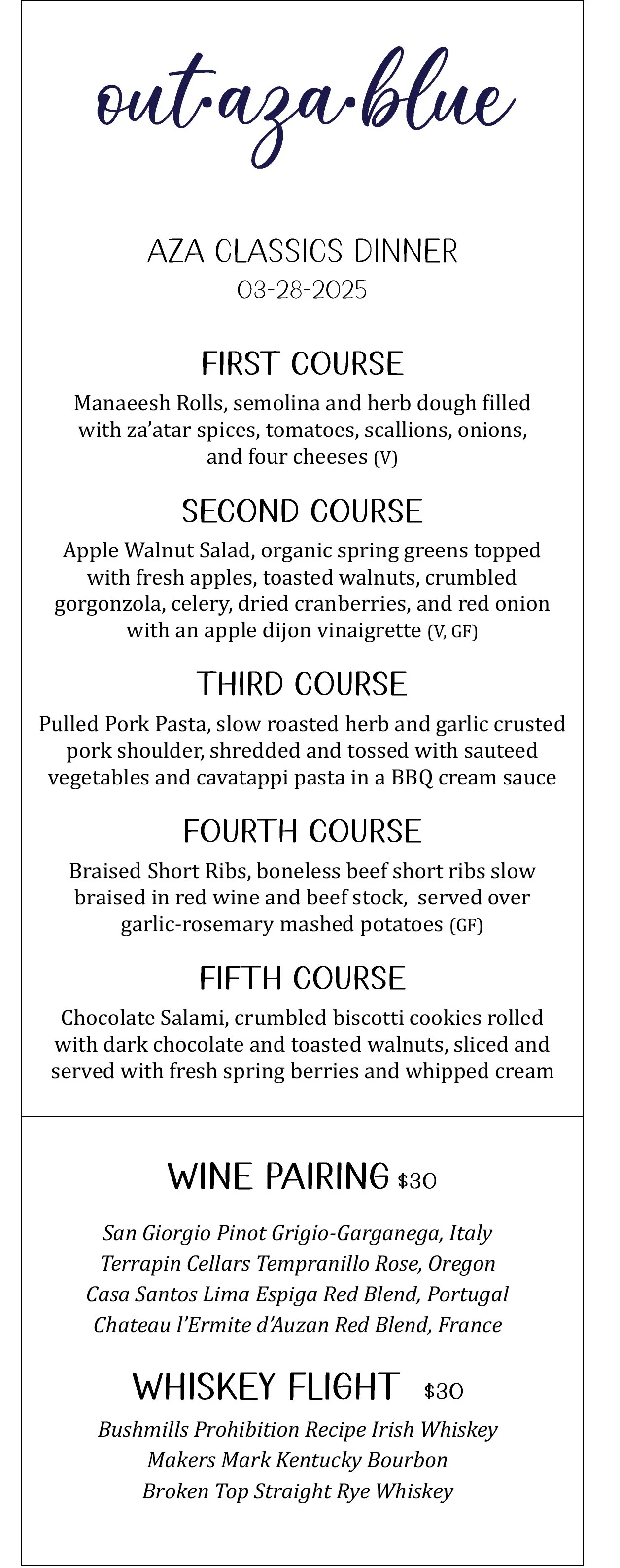 Doors open at 6pm for drinks and appetizers, dinner starts promptly at 6:30pm.