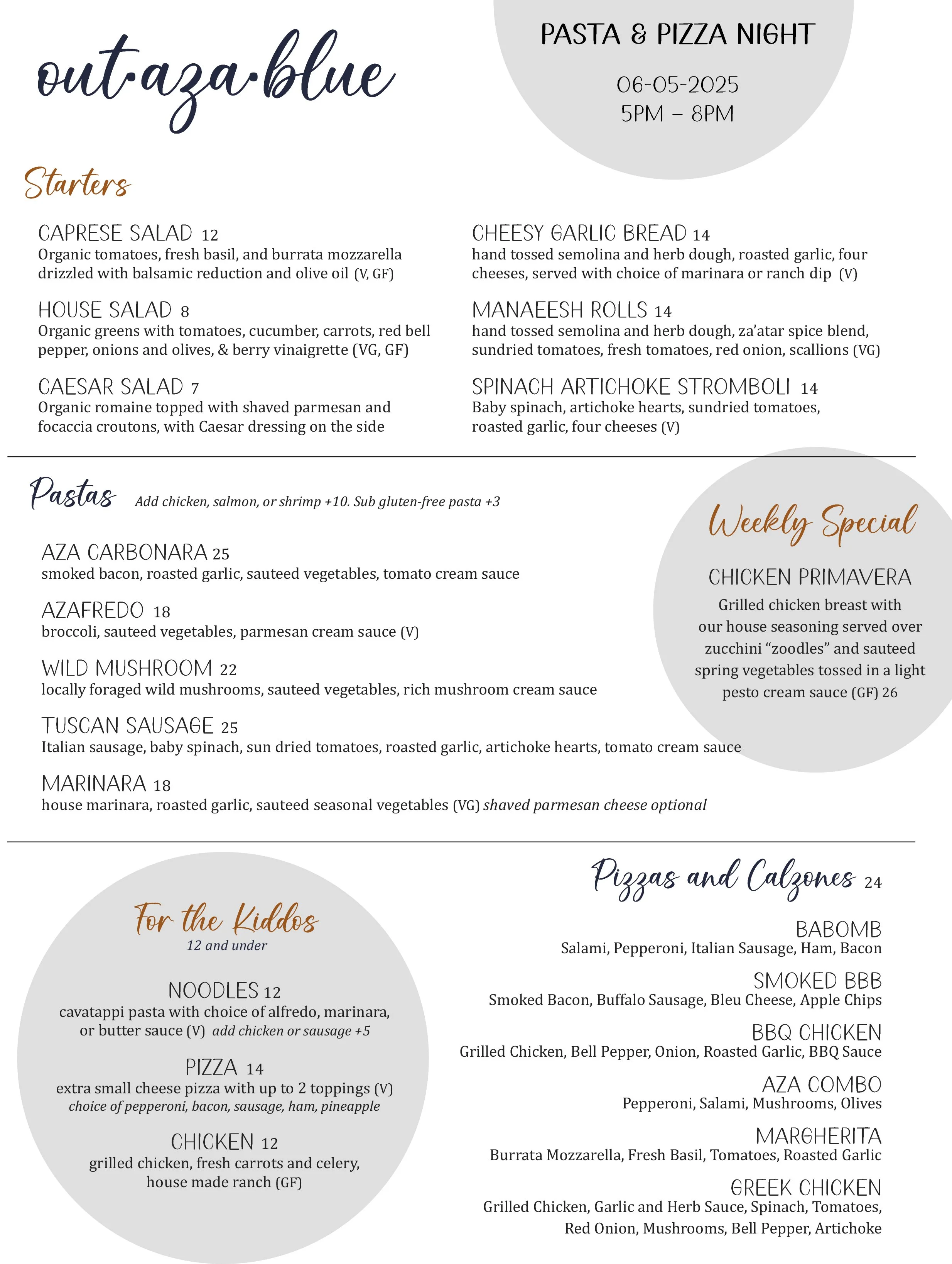Pasta & Pizza Night Thursday, June 5, 2025 5:00 PM 8:00 PM 17:00 20:00 57625 NW Wilson River Hwy Gales Creek, OR 97117 (map) Google Calendar ICS make a reservation Name * First Name Last Name Phone * (###) ### #### Email * Number of Guests * Reservation Time * 5:00pm 5:30pm 6:00pm 6:30pm 7:00pm 7:30pm Seating Preference * Indoor Dining Room Outside Creekside Patio No Preference Message Thank you! You will receive a text or email confirmation within 48 hours. If reserving less than 24 hours in advance, please call the restaurant directly for availability.